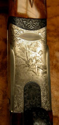 Perazzi MX/8 12ga Sporting shotgun is finished in incredible SCO style Diana Goddess of the Hunt images. Engraved by Perazzi master engraver Carlo Pasotti. The late Pasotti is recognized as one of the premier Bulino stule engravers of Perazzi high grade guns. There will be no more from this artist. This is a custom order gun and had been lightly used.