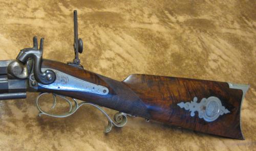 Fantastic example of a New York State percussion rifle/shotgun combo. Marked O.N. Cutter on top barrel flat. Fantastic vernier style rear sight, flip up globe typr front sight. Much original finish remaining. Twin German silver patchboxes. Original rod. Approximate .36 cal rifle over 26 ga smoothbore.