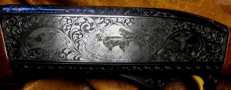 This is one of the most beautiful Remington shotguns that has ever left the Remington Custom Shop in Ilion,NY!!!! Absolutely exquisite game scene engraving and fully figured beautifully checkered walnut done by the Remington masters. Birds and dogs on both sides in full coverage F grade fashion.